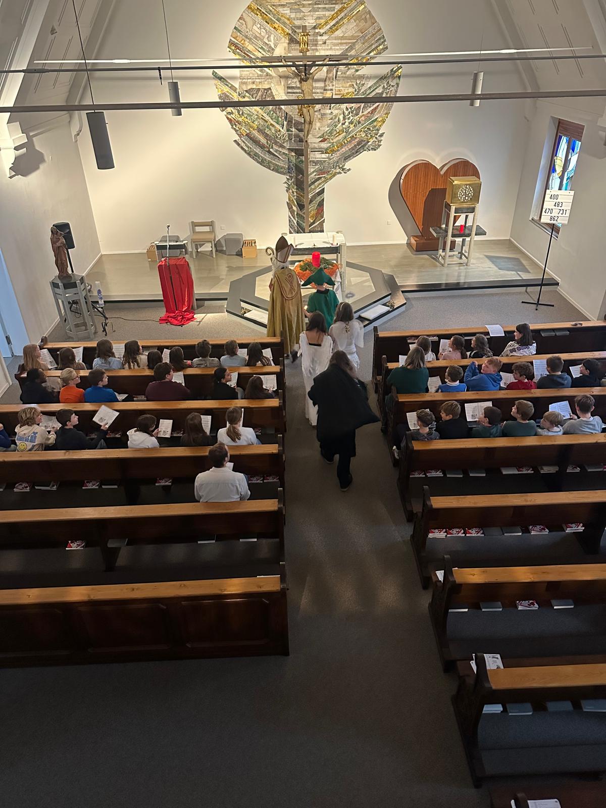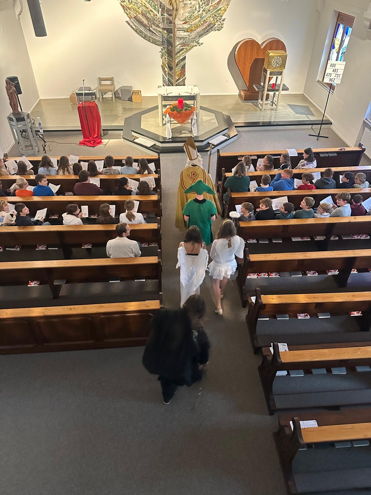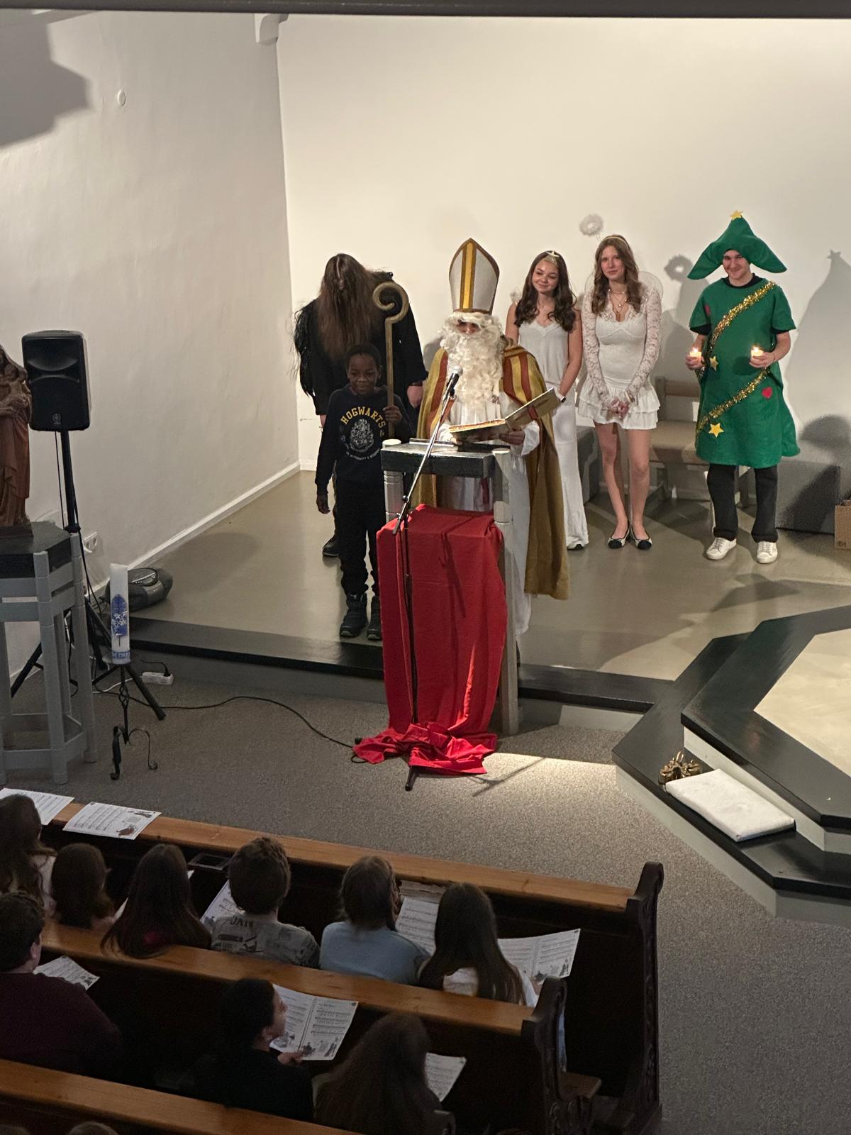 Am 5. Dezember 2025 bekamen die fünften Klassen der Marienrealschule ganz besonderen Besuch: Der Nikolaus kam – begleitet von zwei Engeln, dem Krampus und sogar einem „lebendigen“ Christbaum! In der Hauskapelle las der Nikolaus aus seinem goldenen Buch und berichtete, was er über die Schülerinnen und Schüler erfahren hatte. Dabei durfte natürlich auch das ein oder andere freundliche Wort, aber ebenso ein kleiner Hinweis zur Besserung nicht fehlen. Eine schöne Einstimmung auf die Adventszeit an unserer Schule.