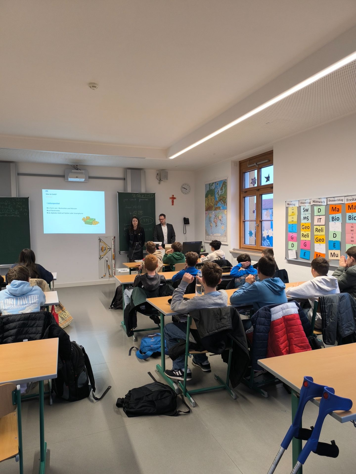 Die Klassen 7b und 7c erhielten in dieser Woche einen besonderen Einblick in die moderne Finanzwelt: Vertreter der VR-Bank Ostbayern-Mitte eG besuchten den Unterricht und hielten einen abwechslungsreichen Vortrag über moderne Zahlungsmöglichkeiten, Online-Banking und viele weitere Themen rund ums Geld. Da die beiden Klassen zeitversetzt arbeiteten, konnte jede Gruppe in zwei intensiven Unterrichtsstunden zahlreiche Fragen stellen und ihr Wissen erweitern. Im Anschluss an den Vortrag machten sich beide Klassen auf den Weg zur Hauptgeschäftsstelle der VR-Bank am Chamer Marktplatz. Dort erwartete die Schülerinnen und Schüler eine spannende Entdeckungstour: Sie durften Sondermünzen, Goldbarren und sogar einen echten 200-Euro-Schein in die Hand nehmen. Dabei erfuhren sie, welche Aufgaben eine Bank täglich erfüllt und wie vielfältig die dortige Arbeit ist. Besonders beeindruckend war der Rundgang durch das Gebäude. Die Klassen bekamen Einblicke in verschiedene Abteilungen, lernten die Funktionen moderner Bankautomaten kennen und konnten verfolgen, wie unterschiedlich die Tätigkeiten der Bankmitarbeiterinnen und -mitarbeiter sind. Ein echtes Highlight bildete zum Schluss die Besichtigung des Tresors – ein Ort, den man eher selten zu Gesicht bekommt und der bei vielen für staunende Gesichter sorgte. Der Unterrichtsbesuch war für die Schülerinnen und Schüler nicht nur spannend, sondern auch äußerst lehrreich. Sie nahmen wertvolle Informationen über den Umgang mit Geld, Sicherheit im Zahlungsverkehr und die Arbeitswelt einer Bank mit nach Hause.