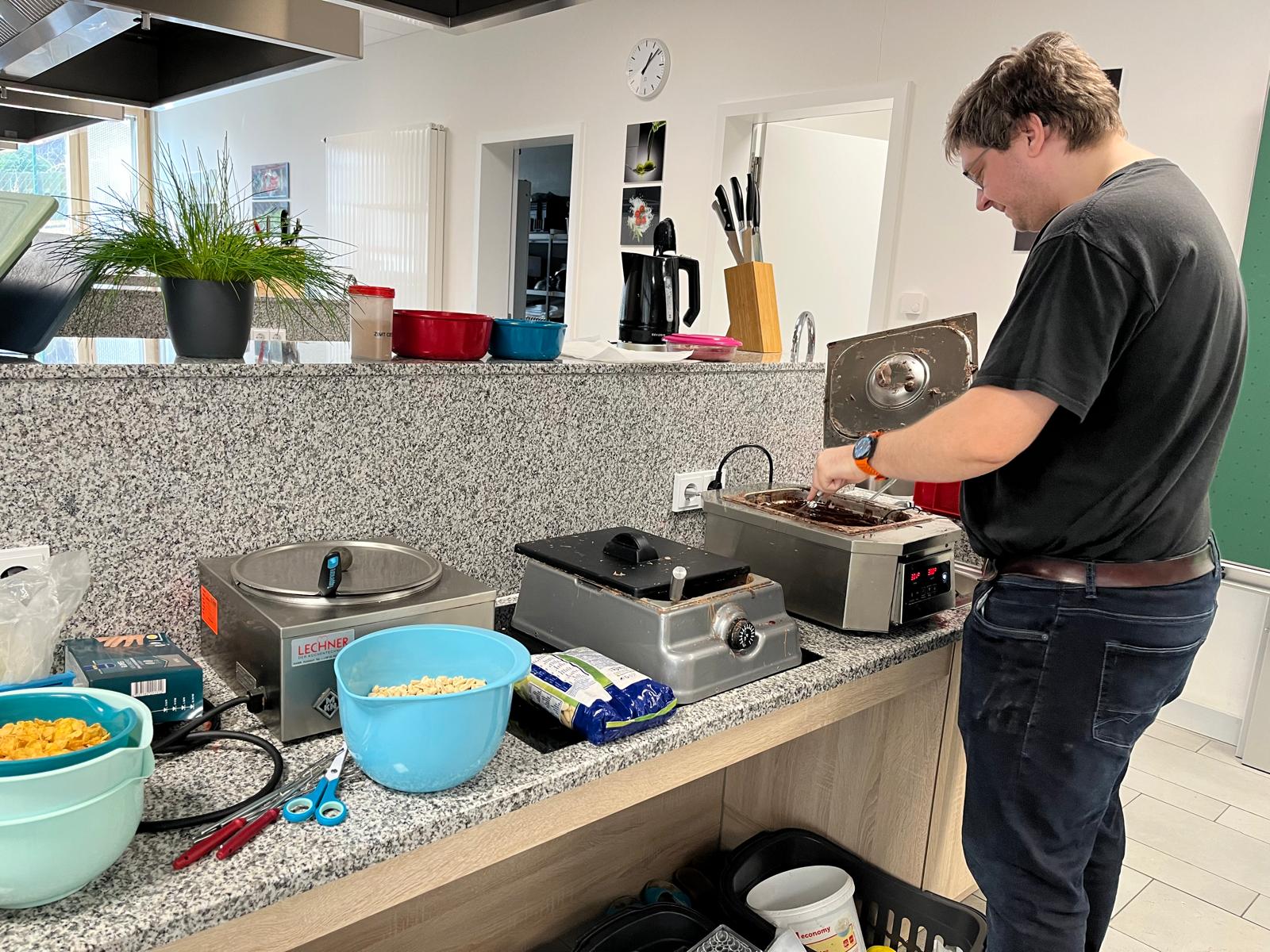 Parallel dazu ging es bei der zweiten Gruppe süß zur Sache. Unter der fachkundigen Anleitung von Christian Lesinski von „Leos Chocolaterie“ wurde die Kunst der Pralinenherstellung zelebriert. In seiner Rolle als engagiertes Mitglied des FMG Cham nahm er sich extra Zeit für die Schülerinnen und Schüler – und das mit vollem Einsatz: Bereits Tage zuvor hatte er Geräte und edle Zutaten in die Schule gebracht, damit alles die perfekte Temperatur erreichen konnte. Schokolade ist eben eine Diva mit Anspruch!
