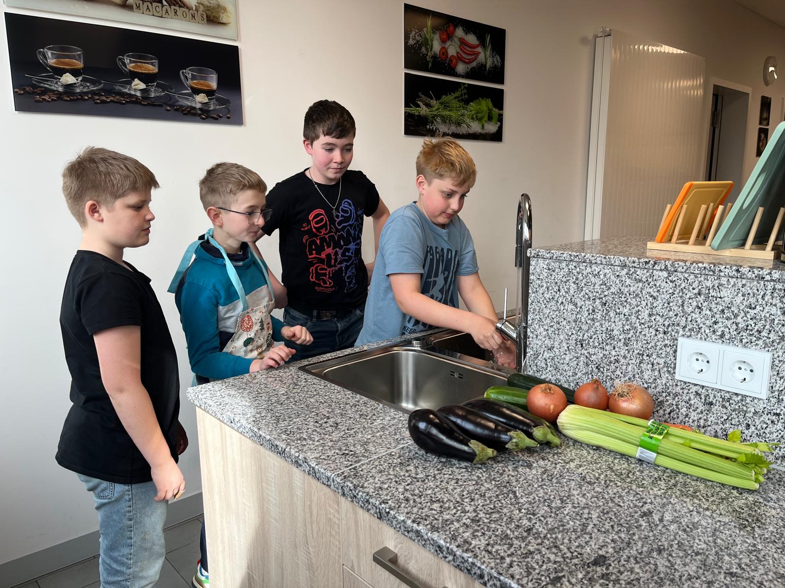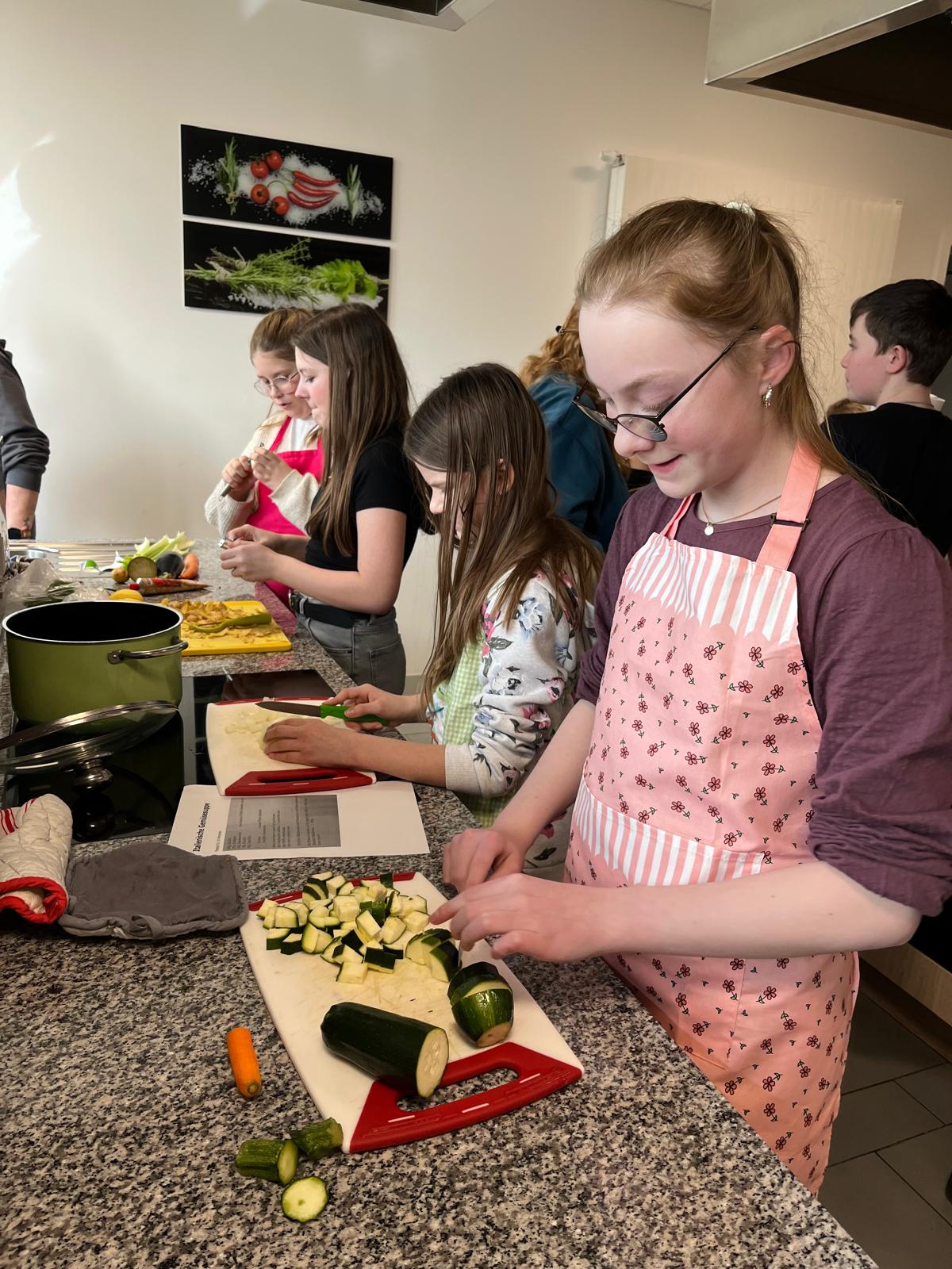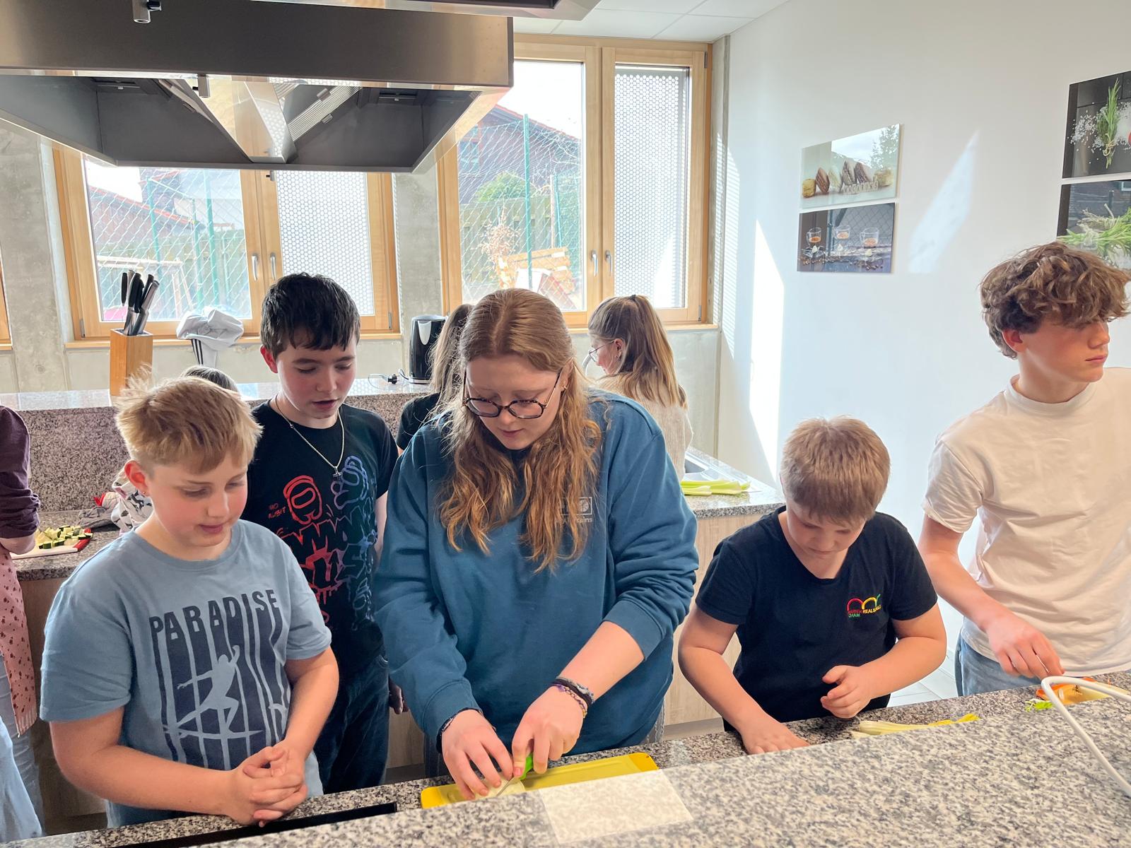 Eine Gruppe verwandelte die Schulküche in eine duftende Suppenwerkstatt. Mit flinken Fingern wurde geschnippelt, gerührt und abgeschmeckt, bis eine herrlich aromatische Gemüsesuppe entstand. Wer wollte, krönte das Ganze mit zarter Hühnerbrust als Einlage. Hier wurde nicht nur gekocht, sondern mit Leidenschaft verfeinert – Probierlöffel inklusive.