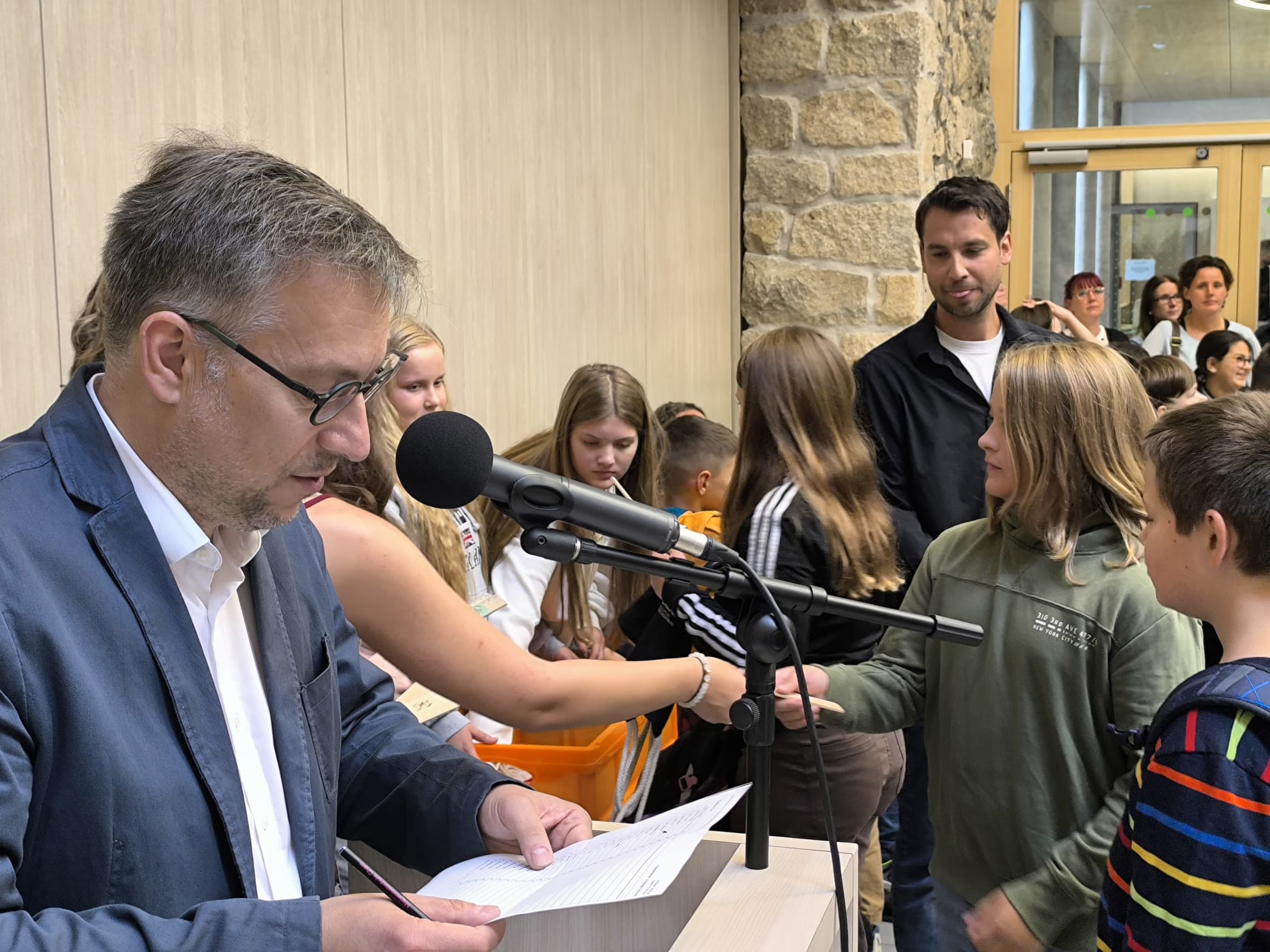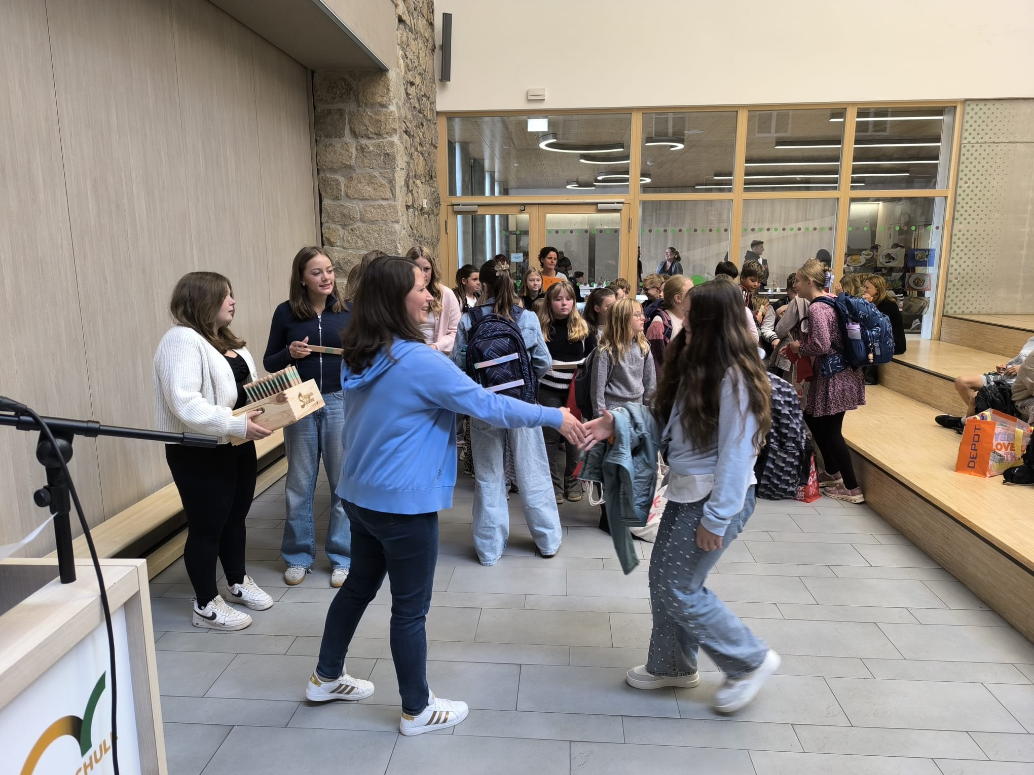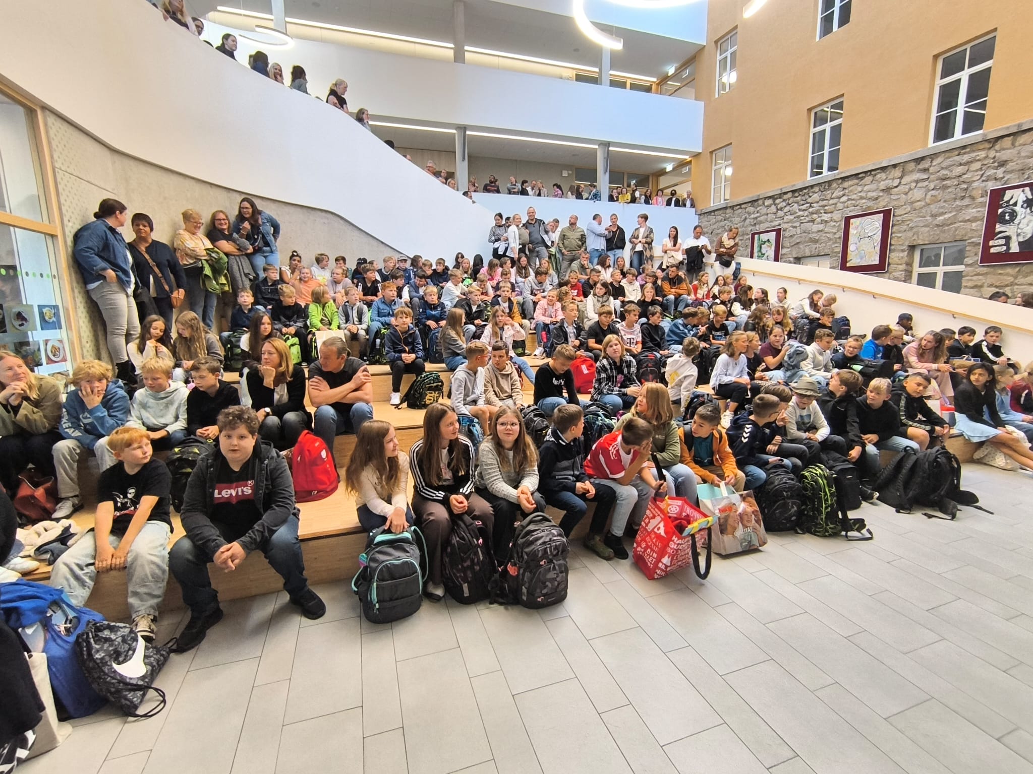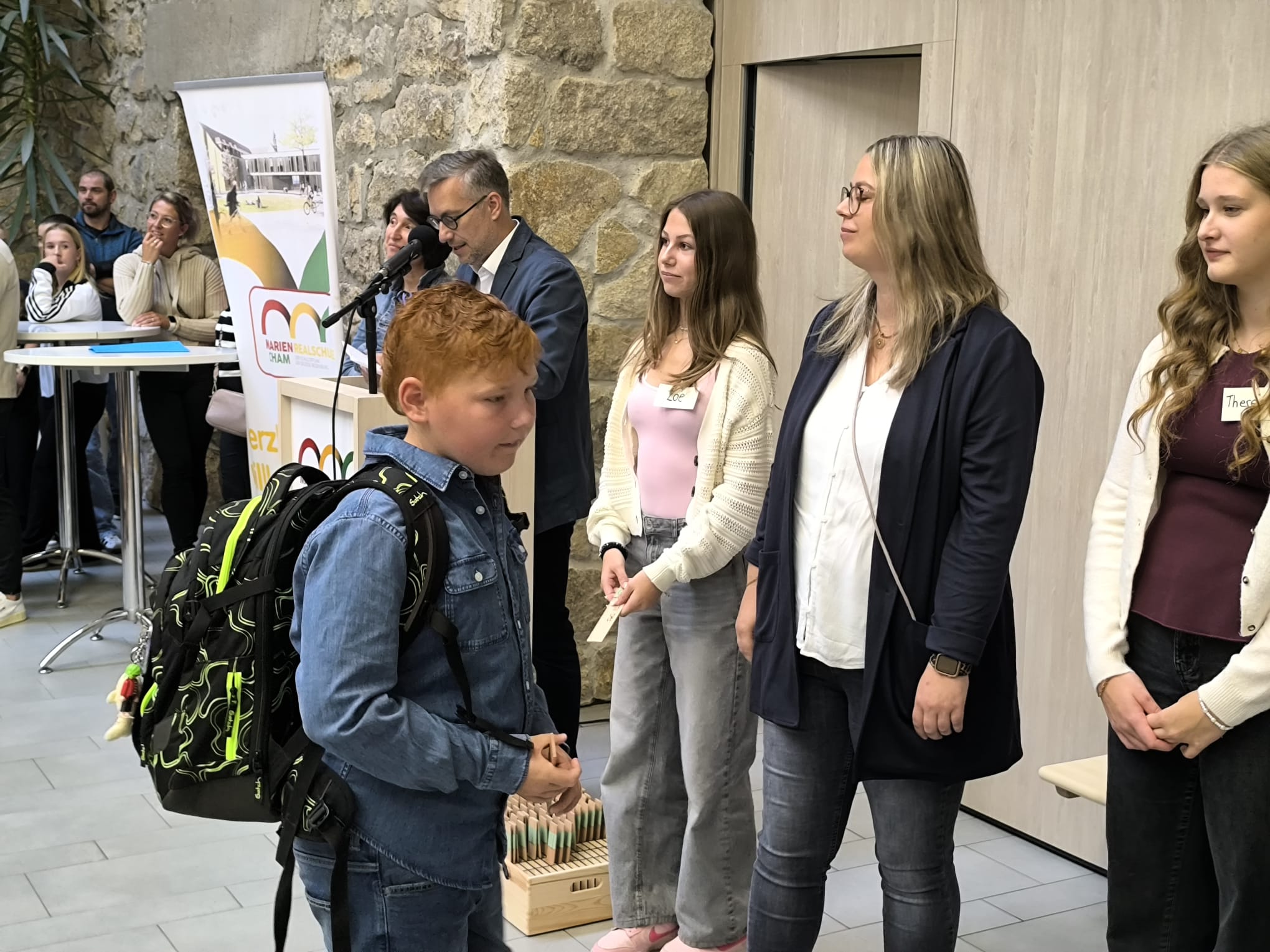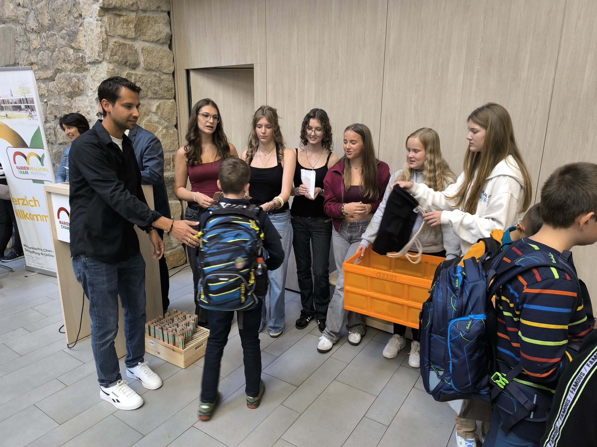 Am ersten Schultag freute sich unser Schulleiter Christian Haringer, als er die 123 neuen Schülerinnen und Schüler der fünften Klassen zusammen mit ihren Eltern in der Aula begrüßen durfte. Viele waren sehr aufgeregt und freuten sich darauf gleich in ihr neues Klassenzimmer zu gehen. Die Klassenleitungen Andreas Schmitt, Verena Hennefarth, Lisa Bauer, Markus Dietl und Veronika Werner schüttelten den Realschulanfängern die Hand und die Tutoren überreichten jeder Schülerin und jedem Schüler einen Marienrucksack, ein Lineal und einen Kugelschreiber zum Start. Spendiert hat diese Willkommensgeschenke der Förderverein der Schule.