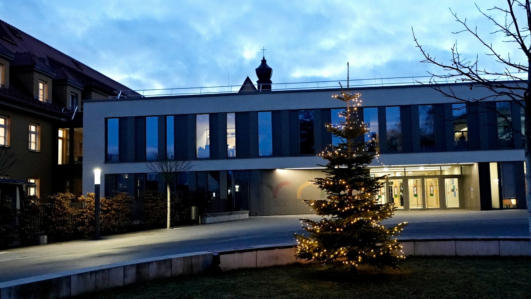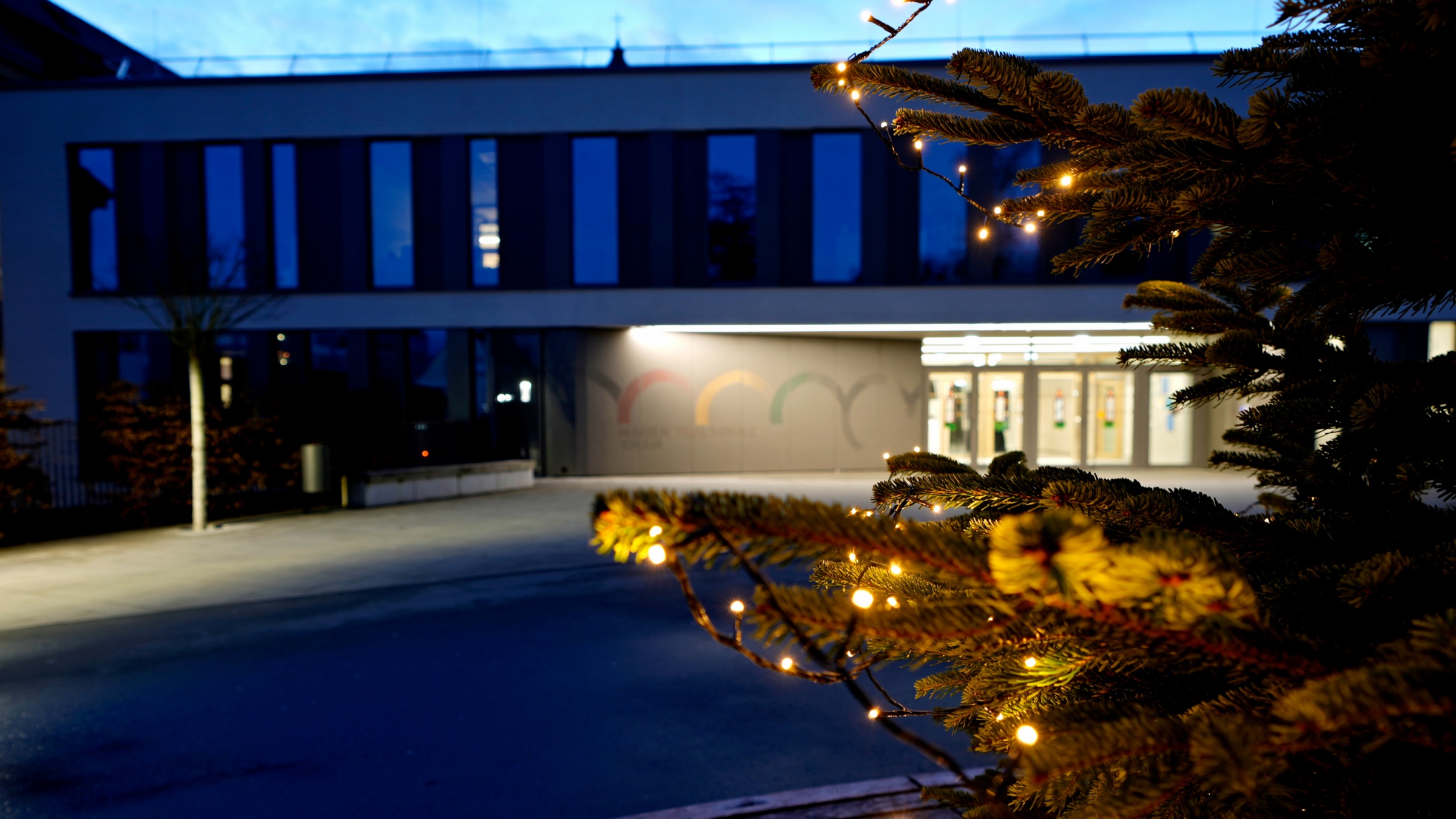 Die Fotos zeigen den festlich geschmückten Weihnachtsbaum vor dem Haupteingang der Marienrealschule Cham. Die warmen Lichter begrüßen die Schülerinnen und Schüler bereits beim Ankommen und sorgen in den frühen Abendstunden für eine stimmungsvolle Atmosphäre auf dem Pausenhof.