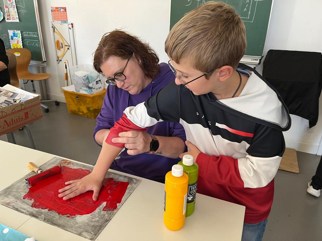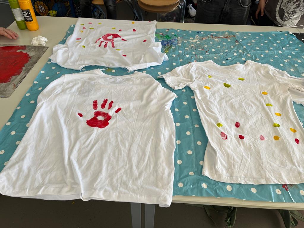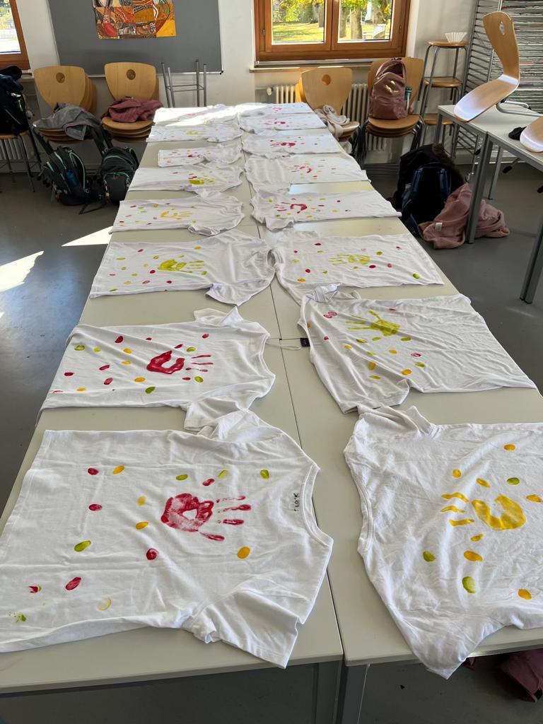 Die Teilnehmer gestalteten zunächst ihre eigenen T-Shirts, indem sie ihre Handabdrücke in Gelb, Grün oder Rot – den Schulfarben – darauf prägten. Als Zeichen der Verbundenheit tupften sie zusätzlich jeweils einen Fingerabdruck darauf, sodass ein farbenfrohes Gemeinschaftszeichen entstand.