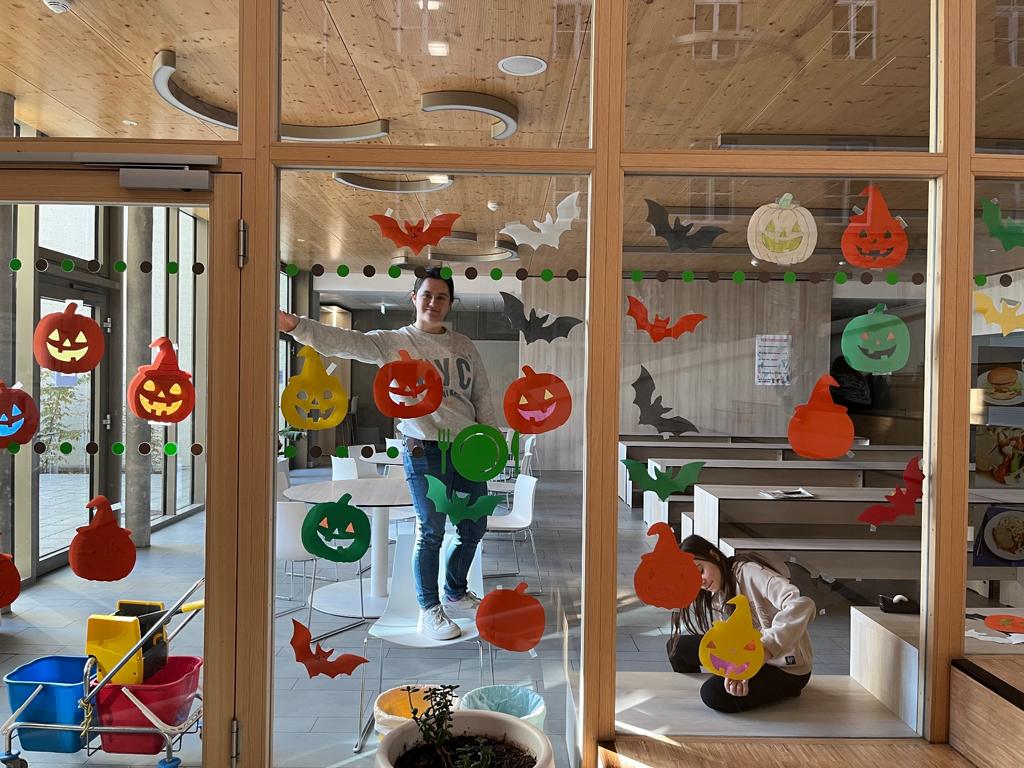 Anschließend wurden Kürbisse und Fledermäuse gestaltet und sichtbar an den Fenstern der Mensa befestigt, sodass jeder das erste „Gemeinschaftswerk“ des Wahlfachs begutachten kann.