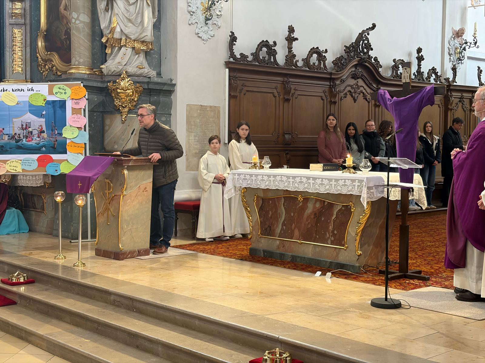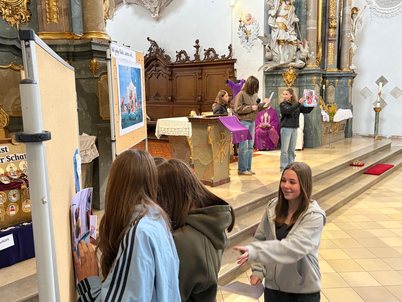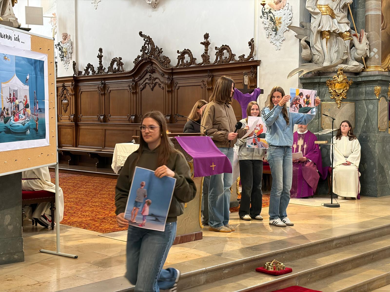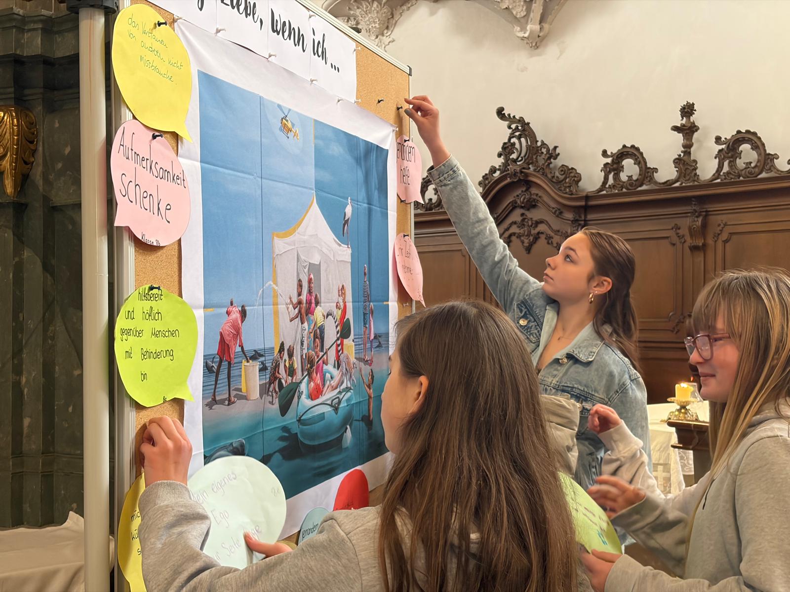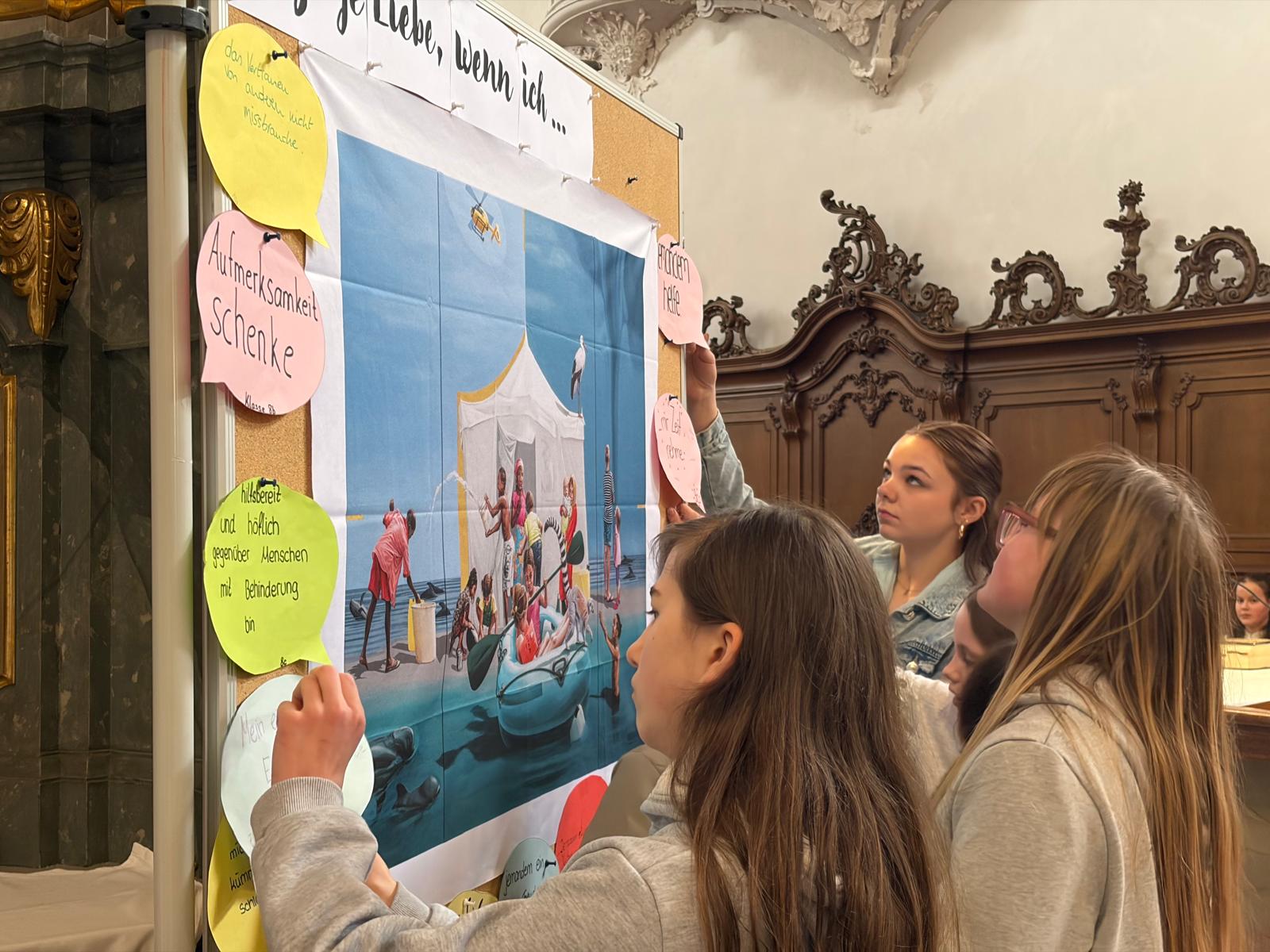 Bereits in den Klassen hatten sich die Jugendlichen in ihren Morgenkreisen am Montag mit der Frage beschäftigt, wie sie selbst Liebe und Wertschätzung zeigen können. Ihre Gedanken dazu hielten sie auf bunten Sprechblasen fest – etwa mit Aussagen wie „… ich mir Zeit nehme für andere“ oder „… ich elektronische Geräte weglege und mit anderen spiele“ oder " ...ich mich um jemanden kümmere, dem es schlecht geht". Diese Sprechblasen schmückten während des Gottesdienstes den Altarraum und machten die Vielfalt der Beiträge sichtbar.