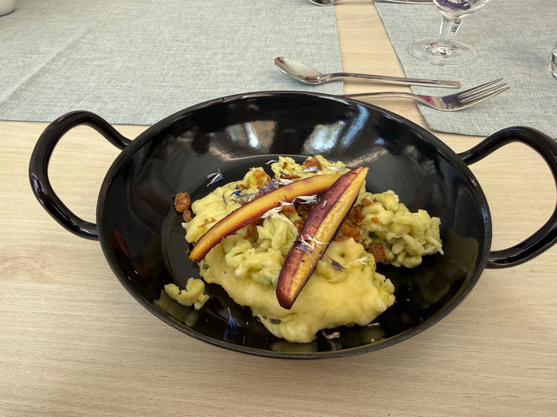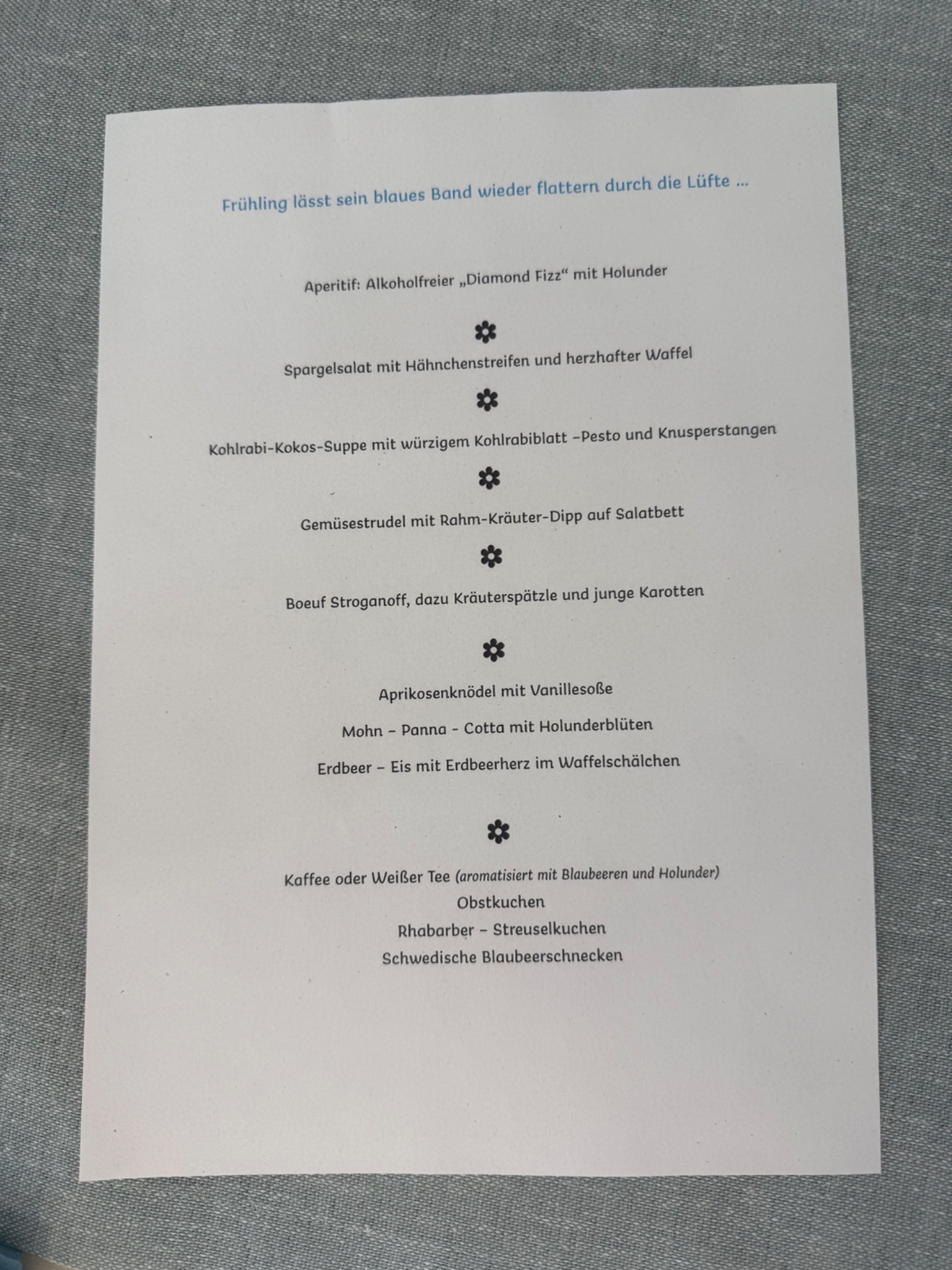 Serviert wurden unter anderem ein erfrischender Spargelsalat mit herzhafter Waffel, eine feine Kohlrabi-Kokos-Suppe mit Pesto und Knusperstangen sowie ein Gemüse-Strudel auf knackigem Salatbett. Den kulinarischen Höhepunkt bildete das klassische Boeuf Stroganoff mit Kräuterspätzle und jungen Karotten.