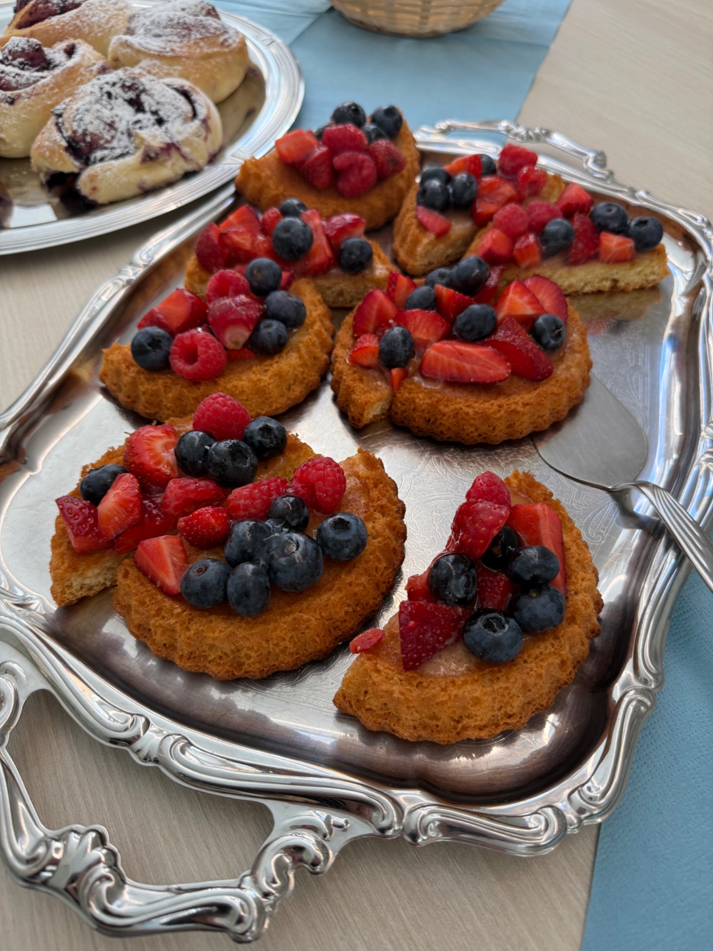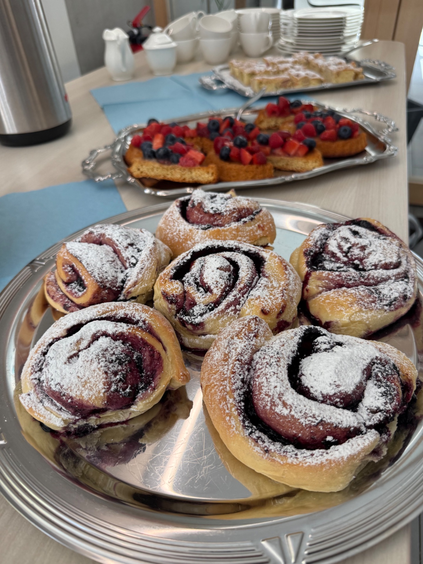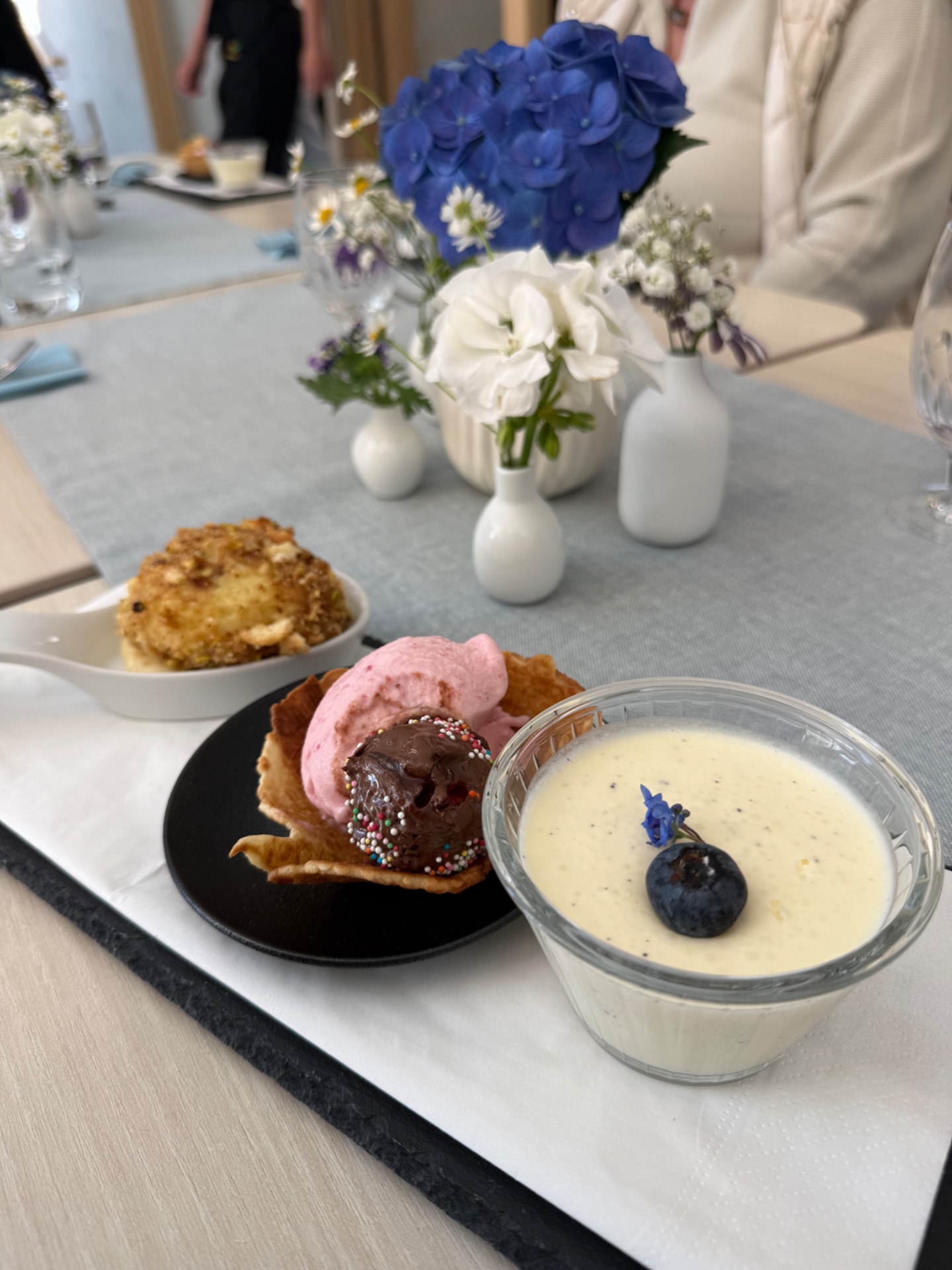 Auch beim süßen Abschluss ließen die Schülerinnen und Schüler keine Wünsche offen: Ob Aprikosenknödel mit Vanillesoße, feines Mohn-Panna-Cotta mit Holunderblüten oder das Erdbeer-Eis mit Erdbeerherz – die Vielfalt der Desserts und die Auswahl an Kaffee, weißem Tee mit Beeren, Obstkuchen, Rhabarber-Streuselkuchen und schwedischen Blaubeerschnecken zeigten die große Leidenschaft der Prüflinge für das Handwerk.