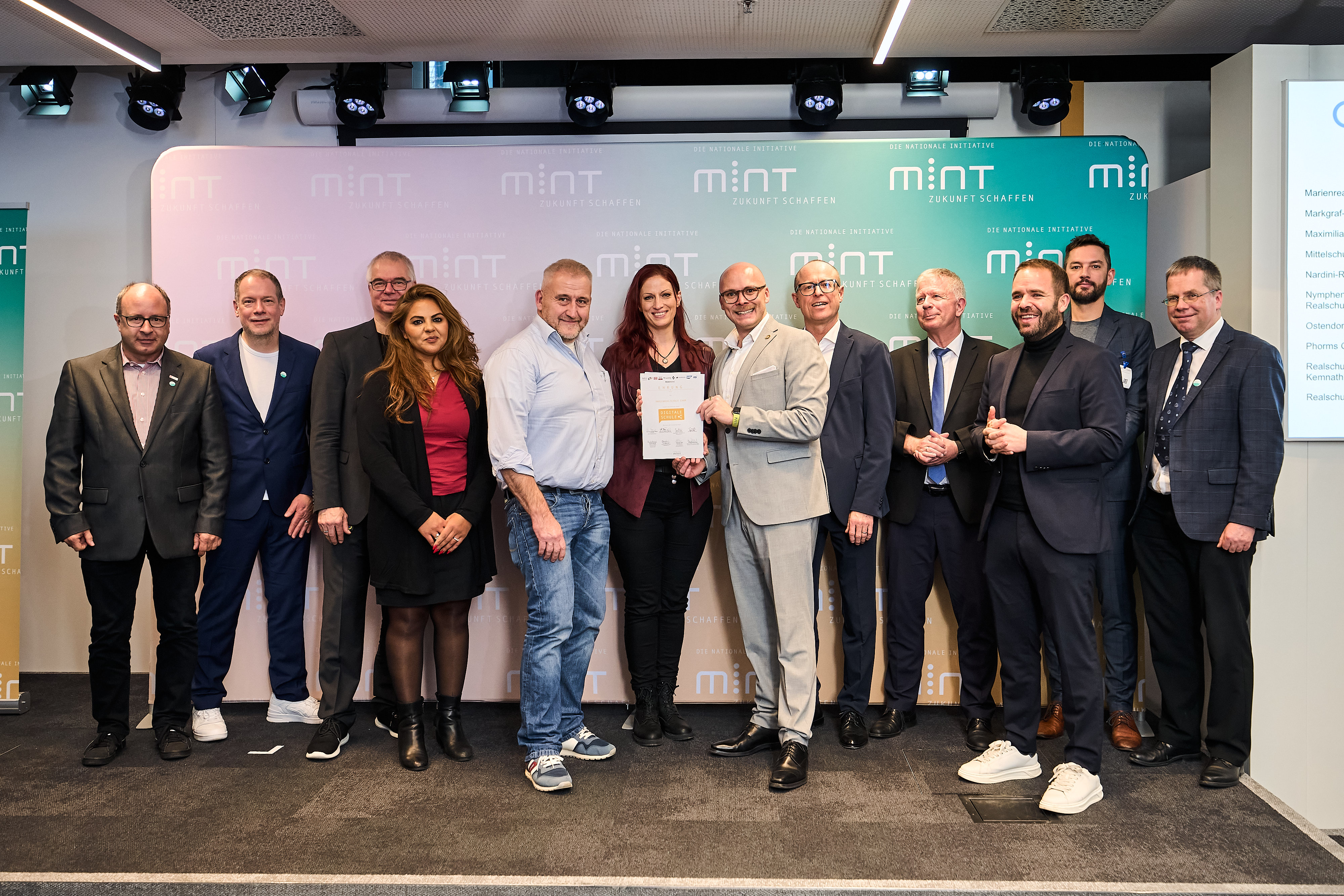 In den Münchner Räumen von Google Germany wurden Mitte Dezember zahlreiche Schulen aus Bayern als „MINT-freundliche Schule“ und „Digitale Schule“ ausgezeichnet. Die Ehrungen nahmen Bayerns Staatsminister für Digitales, Dr. Fabian Mehring und Dr. Wolfgang Mutter vom Bayerischen Kultusministerium gemeinsam mit Dr. Christof Prechtl (vbw – Vereinigung der Bayerischen Wirtschaft e. V.), Christian Fischer (MINT Zukunft e.V.) und Dr. Wieland Holfelder (Google) sowie weiteren Vertreterinnen und Vertretern aus Gesellschaft, Wirtschaft und Wissenschaft vor.