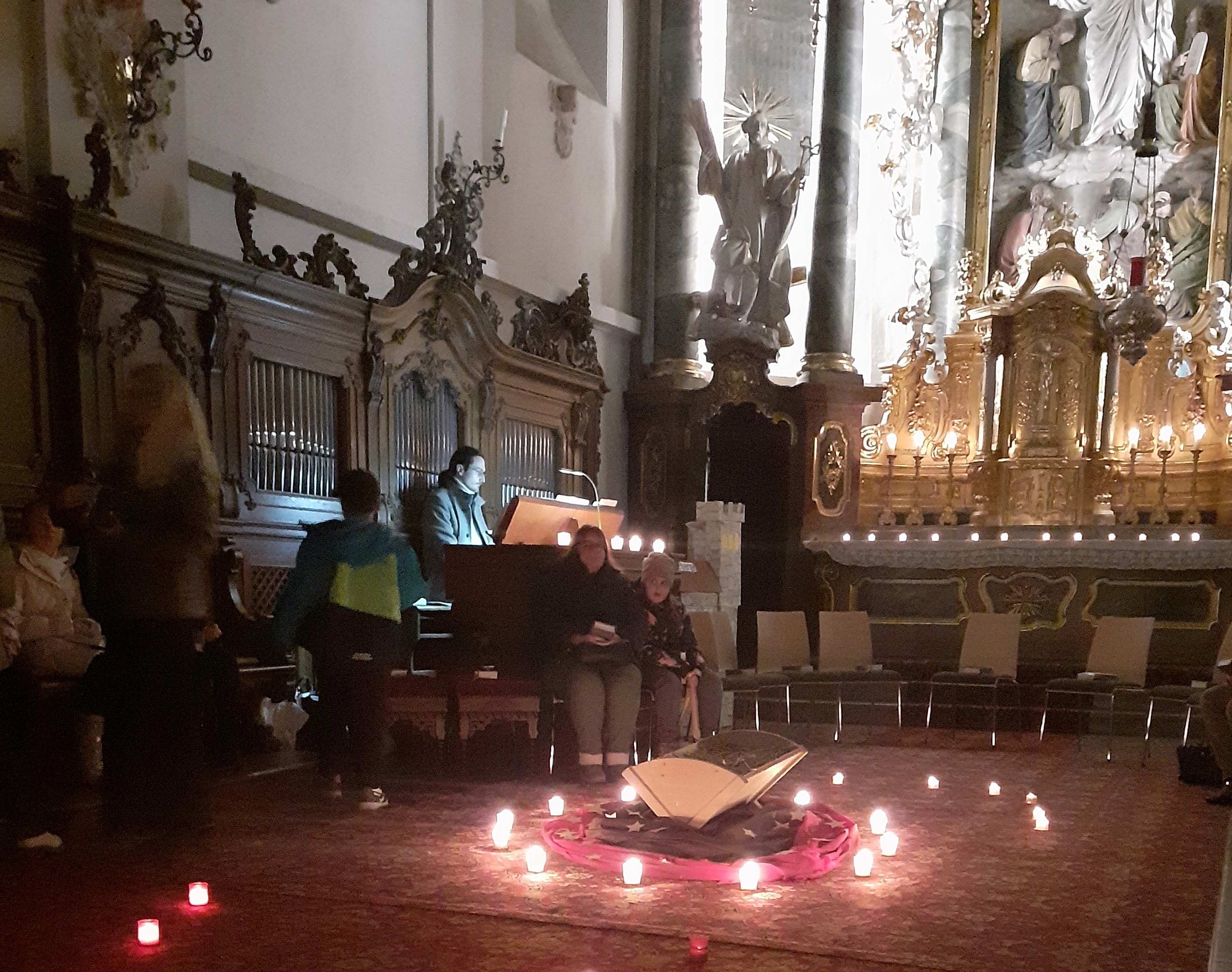 Mit hunderten kleinen Kerzen war die Kirche stimmungsvoll ausgeleuchtet. Vor allem die jungen Teilnehmer versammelten sich im Chorraum der Kirche. Dort war, umgeben von hellen Lichtern, eine leere Krippe aufgestellt. Sie symbolisiert die Adventszeit, in der wir Christen uns auf die Ankunft des Herrn in der Weihnachtsnacht vorbereiten. Auch die Besucher taten dies in dieser „Nacht der Lichter“ mit gemeinsamen Adventslieder, nachdenklichen Geschichten, Gebeten und Fürbitten.