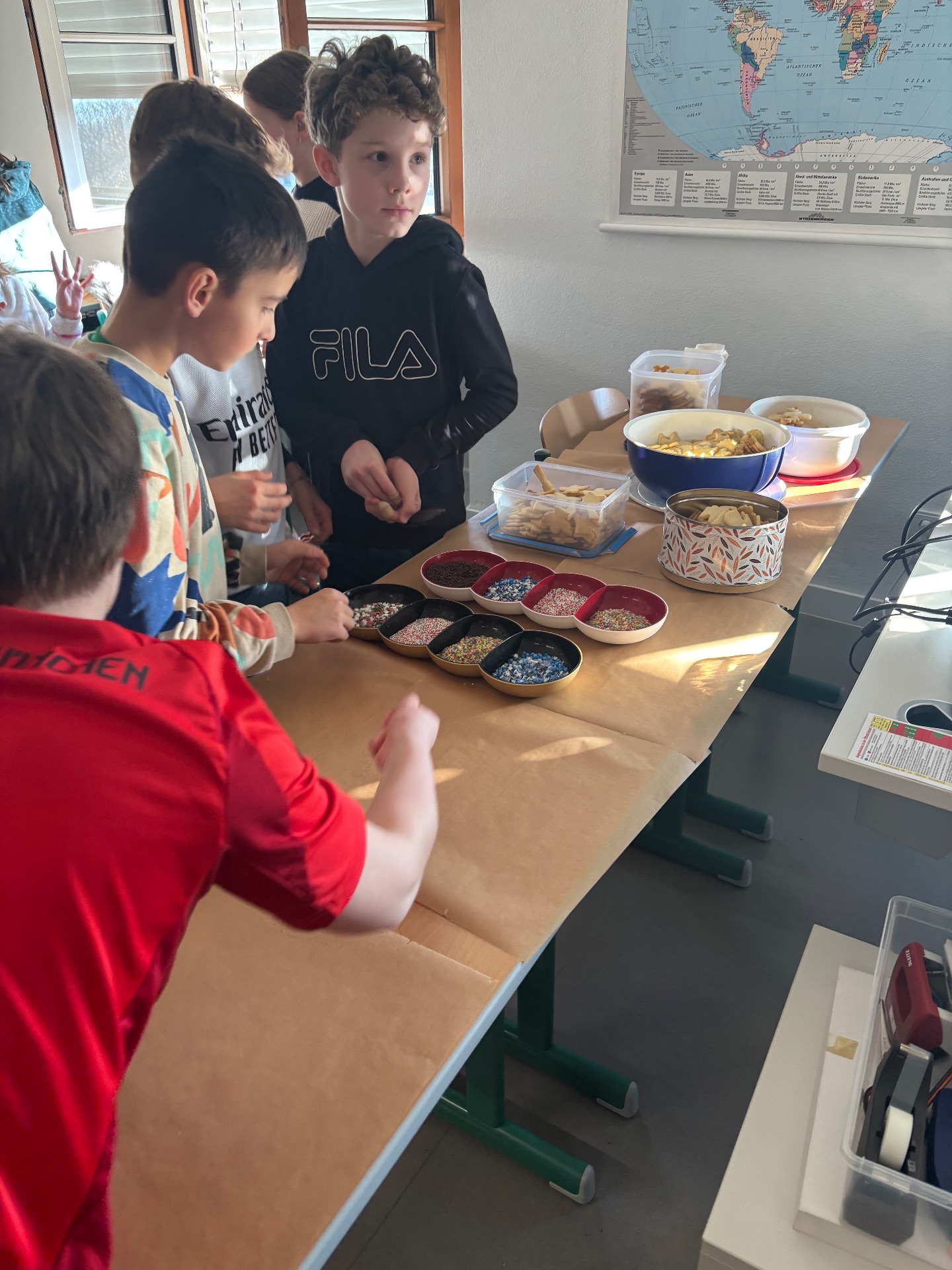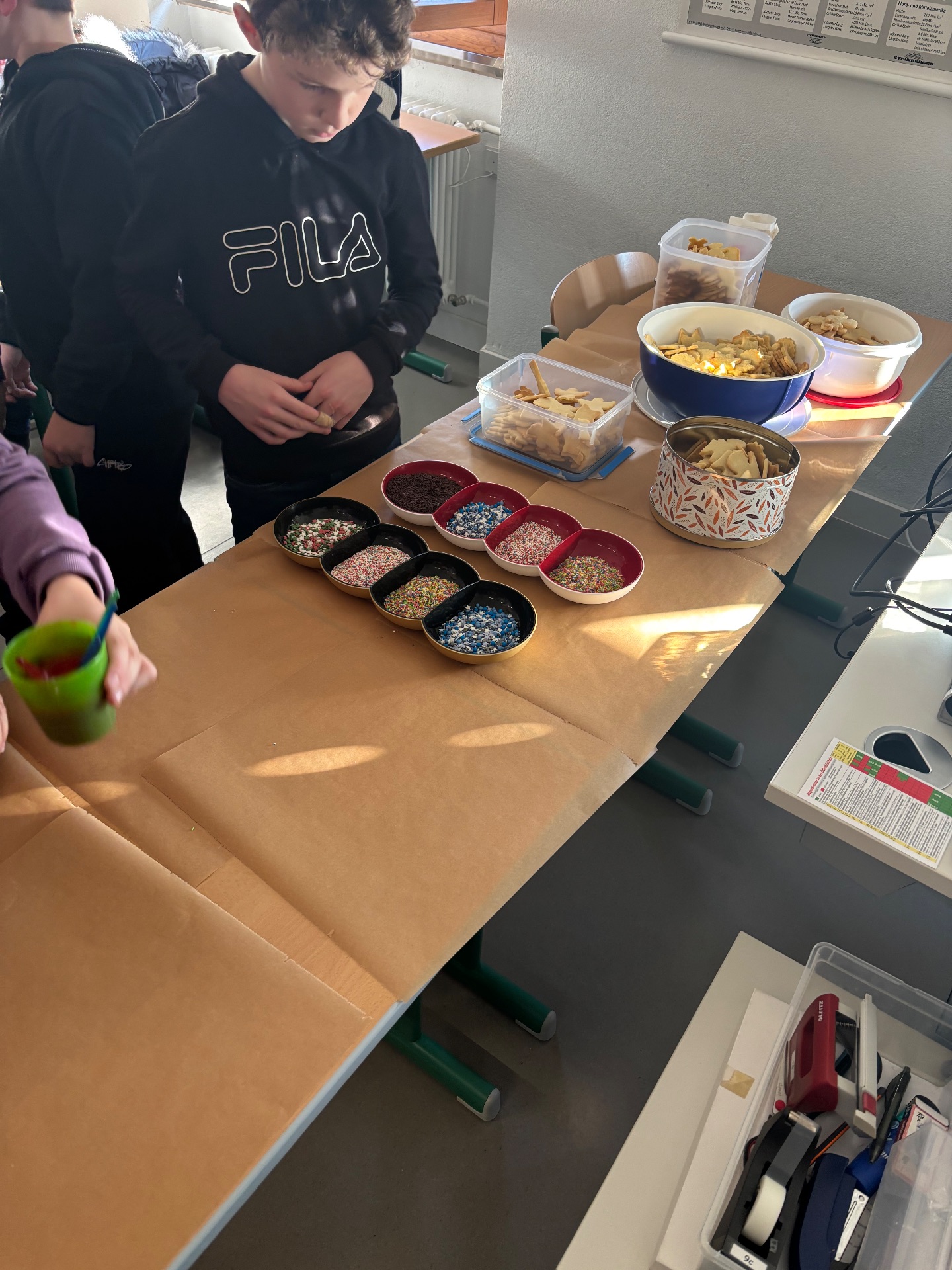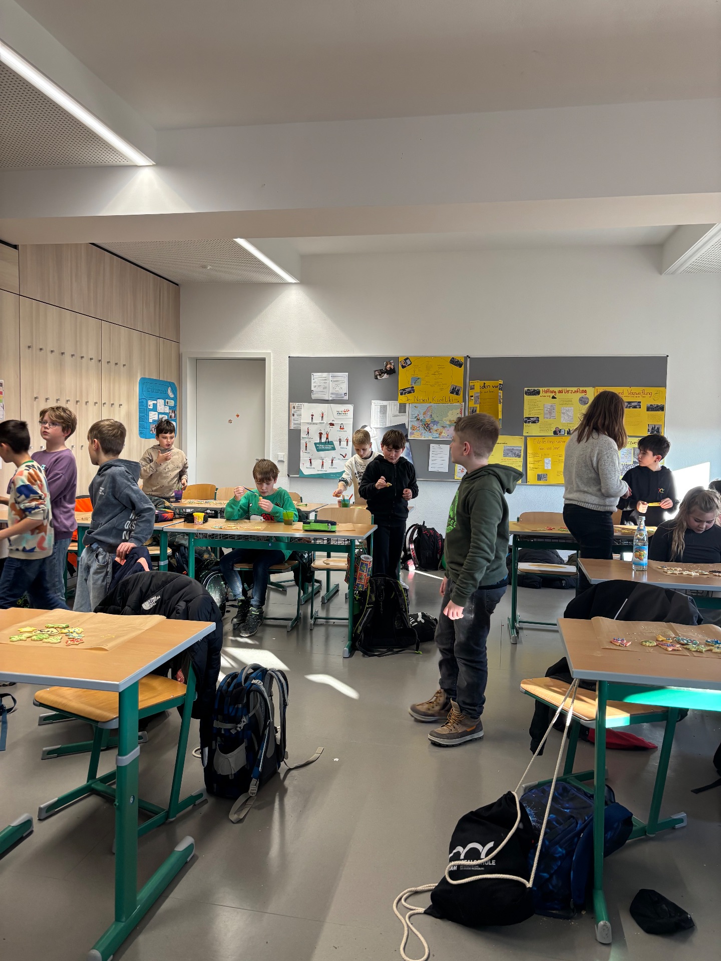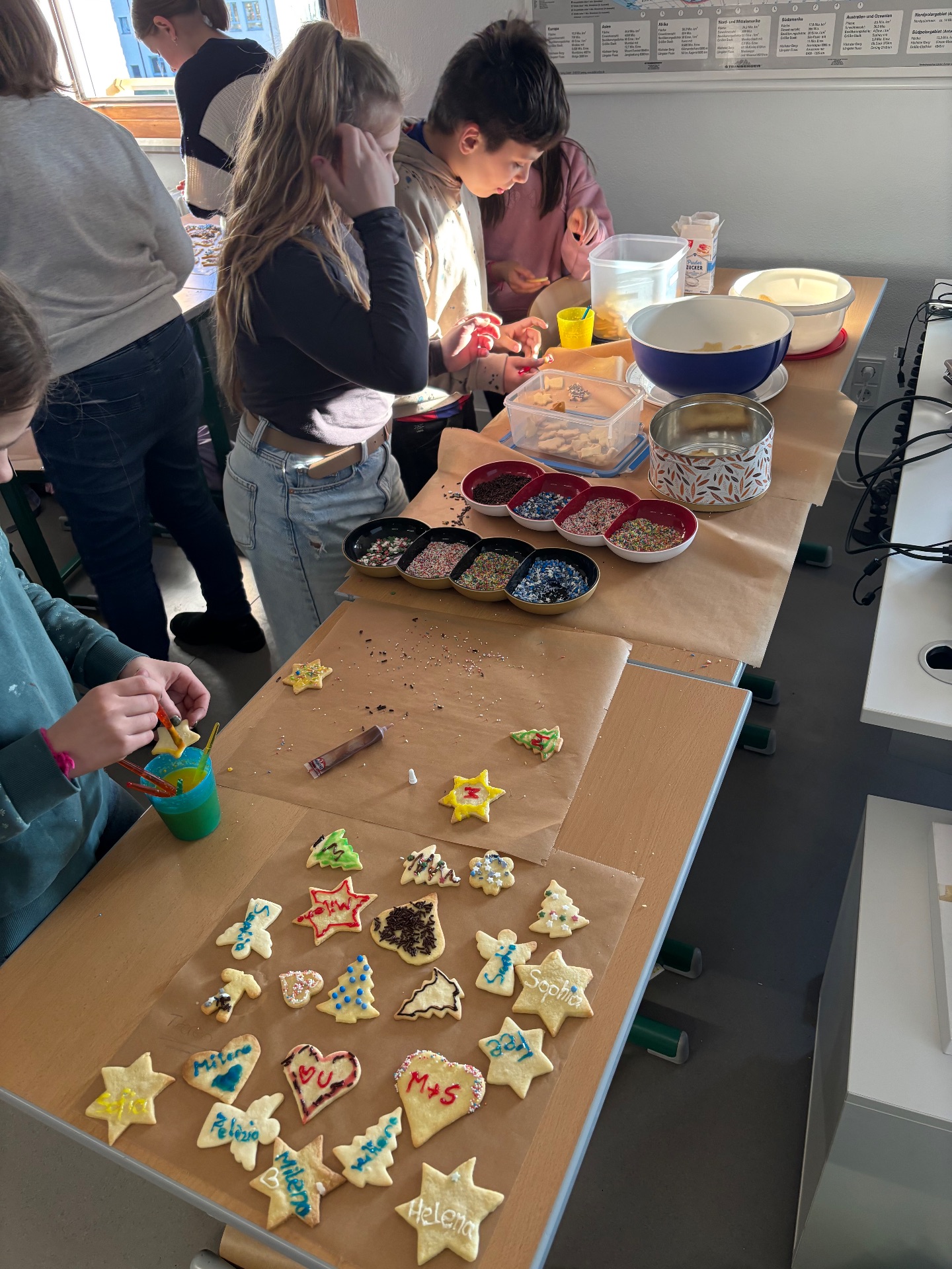 Am vorletzten Tag vor den Weihnachtsferien veranstalteten die Tutorinnen der 9c und 9d nachmittags zusammen mit den Schülerinnen und Schülern der Klasse 5e eine gemütliche Plätzchen-Aktion. In einer fröhlichen Adventsstimmung verzierten die Kinder gemeinsam verschiedene Plätzchen und hatten sichtlich Spaß beim Dekorieren und Ratschen.