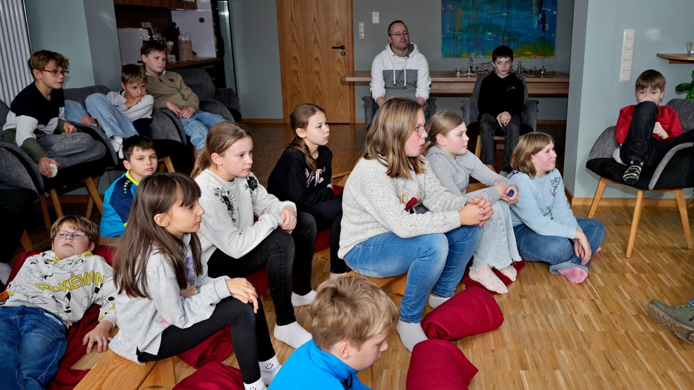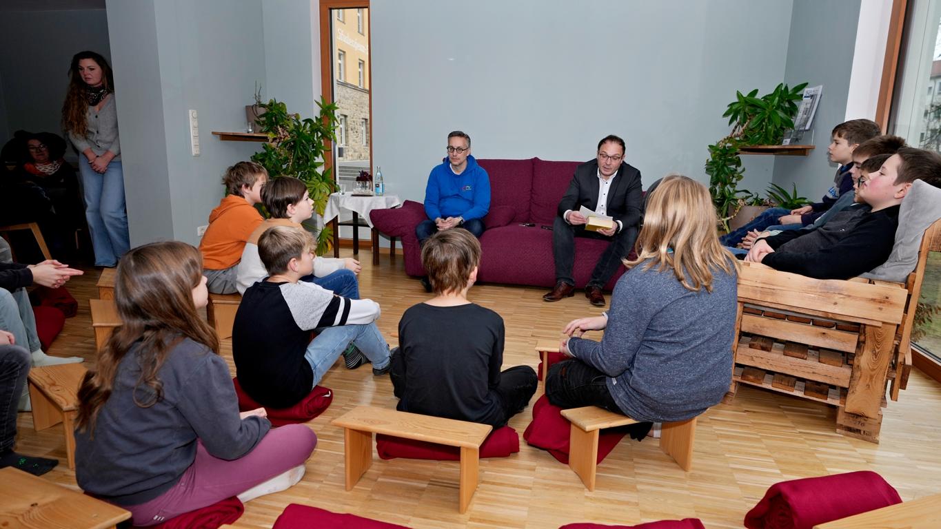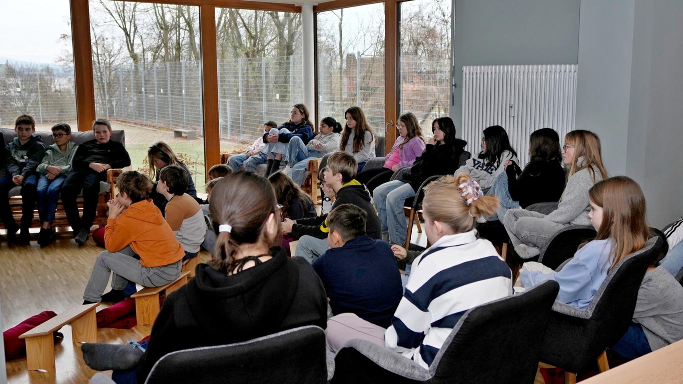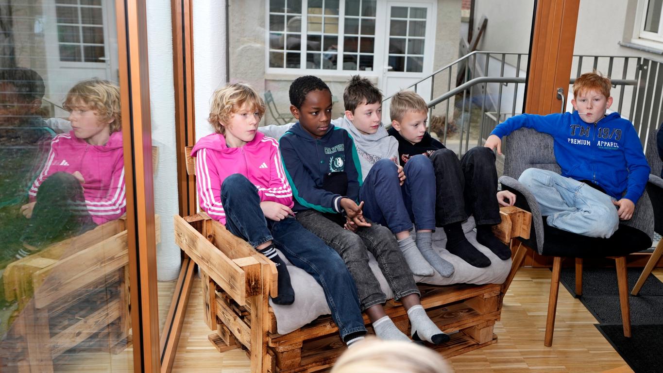 Schon beim Betreten des Maristenhauses, das der Maristenorden regelmäßig großzügig für schulische Aktionen öffnet, wurde klar: Hier steckt Herzblut drin. Jürgen, Ehemann der Mit-Organisatorin Johanna Aschenbrenner, hatte den Raum liebevoll in eine gemütliche Leseoase verwandelt. Hocker, Decken und weitere gemütliche Sitzplätze machten den Fünftklässlern sofort Lust, in die Welt der Bücher abzutauchen.