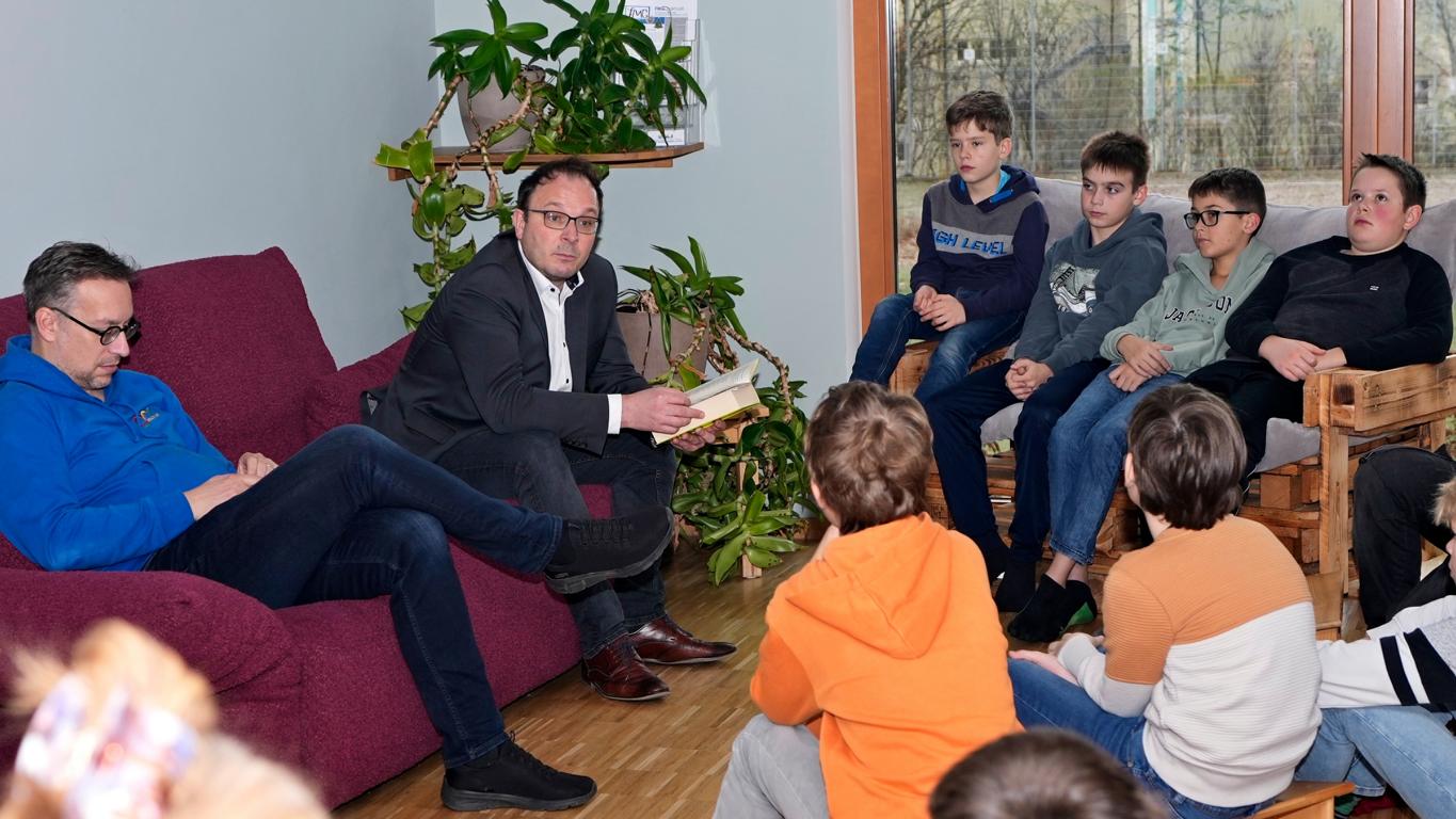 Prominent wurde es, als Bürgermeister Martin Stoiber Platz nahm und mit viel Humor aus „Alles von Herrn Bello“ vorlas – sehr zur Freude der Fünftklässler, die über die Streiche des berühmten sprechenden Hundes herzlich lachen mussten.